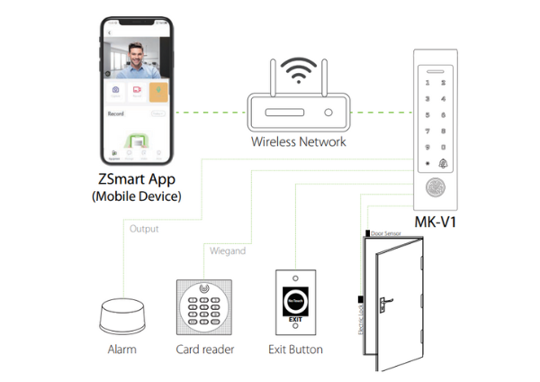 MK-V1 là thiết bị kiểm soát ra vào độc lập được làm bằng hợp kim kẽm với xếp hạng bảo vệ IP65, đảm bảo thiết bị hoạt động 24/7 trong mọi điều kiện thời tiết. MK-V1 cung cấp các phương pháp xác minh bao gồm thẻ RFID, mã PIN và dấu vân tay (tùy chọn). Thiết bị hỗ trợ hai mô-đun thẻ bao gồm 125kHz và 13,56MHz, mang lại sự linh hoạt hơn cho chức năng kiểm soát ra vào. Hơn nữa, MK-V1 là thiết bị kiểm soát ra vào mạnh mẽ cung cấp nhiều tính năng, bao gồm điều khiển từ xa qua kết nối Wi-Fi và Bluetooth với ứng dụng di động ZSmart. Điều này cho phép người dùng được ủy quyền mở khóa cửa từ mọi nơi, lý tưởng cho các doanh nghiệp có nhiều địa điểm hoặc cho những người cần truy cập cơ sở của họ từ xa.